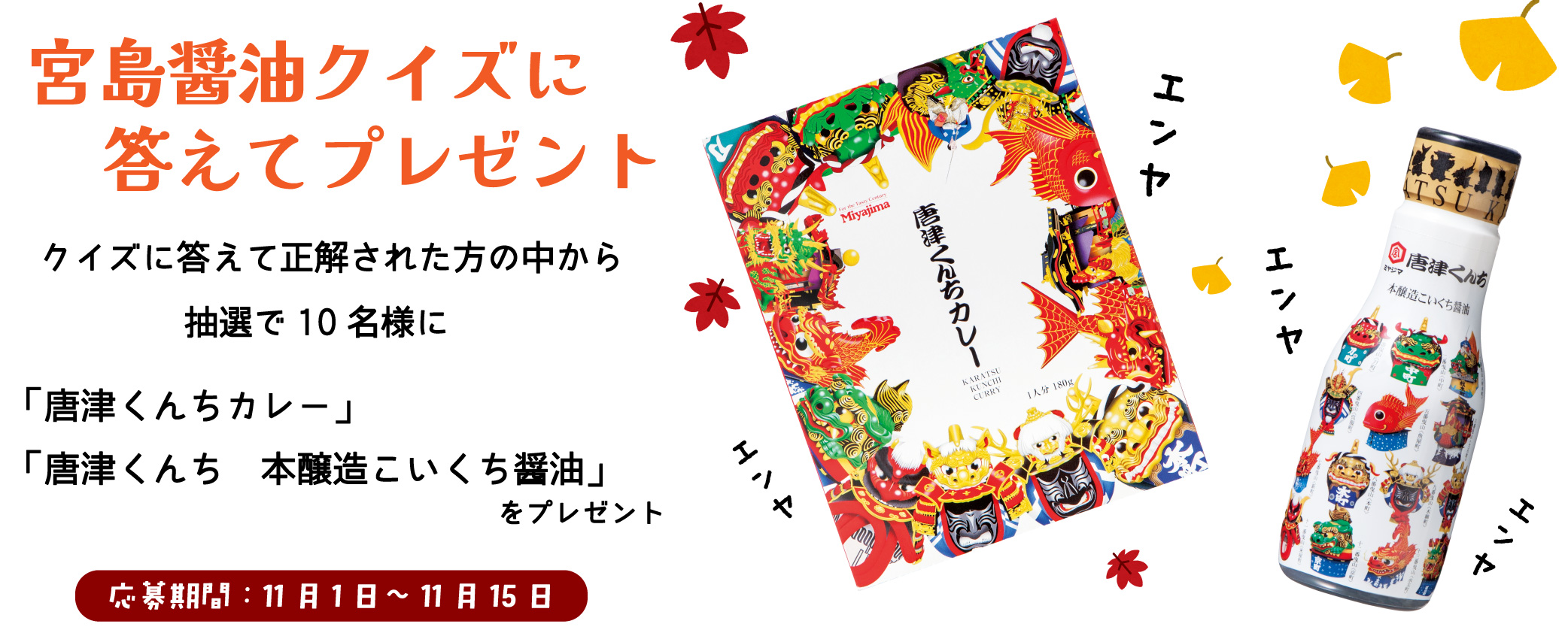 クイズに答えて正解された方の中から、抽選で10名様に「唐津くんちカレー」2個、「唐津くんち 本醸造こいくち醤油」1本をセットにしてプレゼントします。