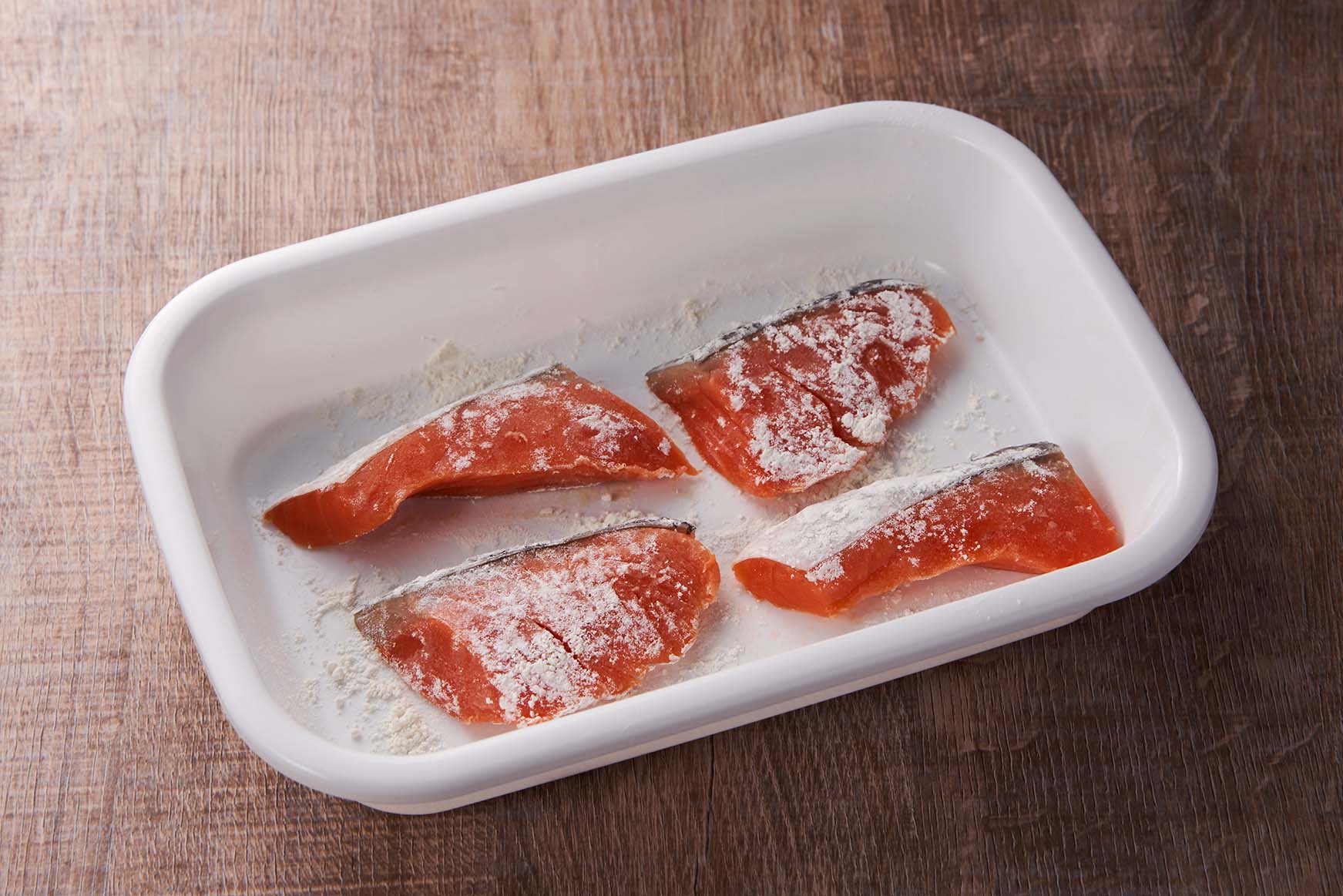 - 鮭はたれの味がからみやすいように、小麦粉をまぶして焼きます。