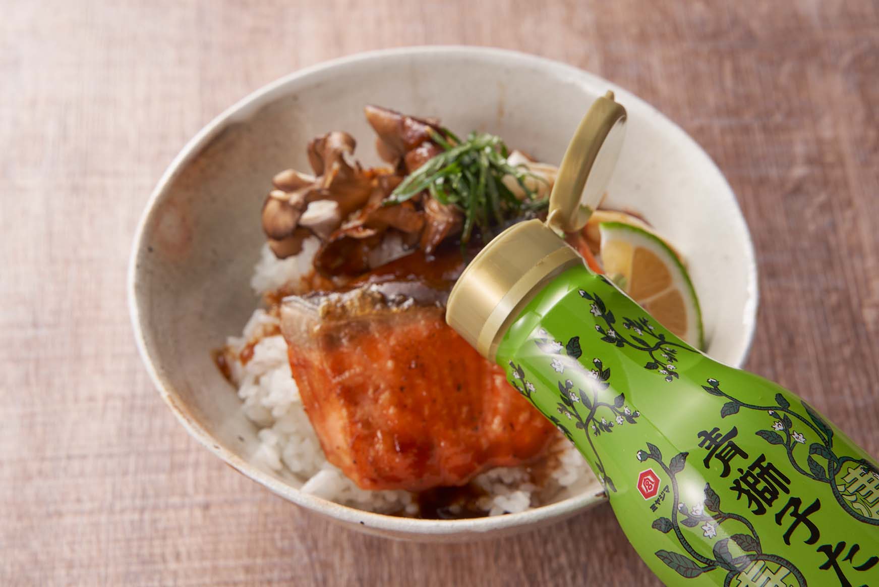 サラダ油を熱したフライパンに鮭、まいたけを並べて、両面に焼き目をつける。ネギを加えてさっと炒め、青獅子たれ醤油味を注いで煮絡める。
