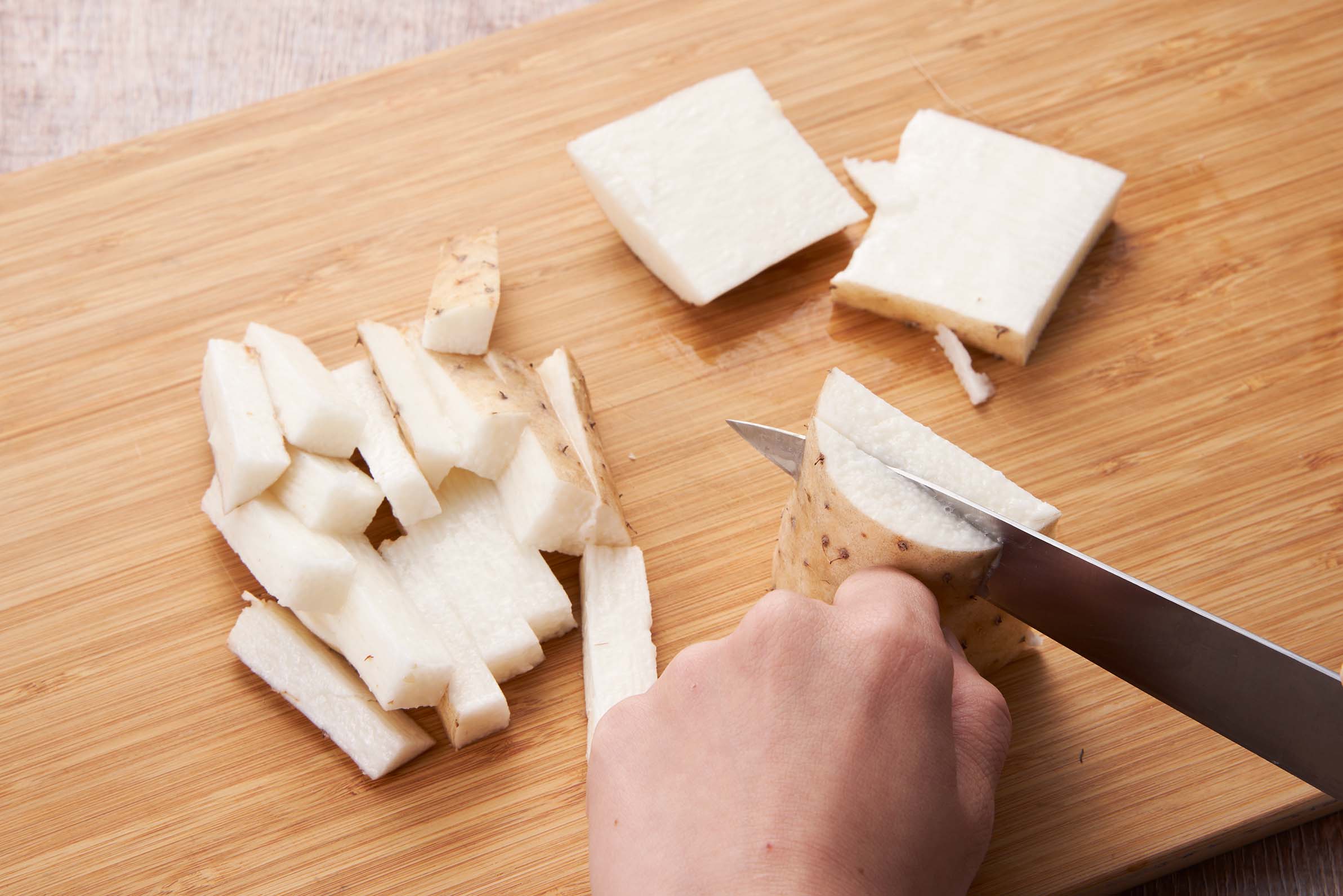 長芋はよく洗ってひげ根を取り、少し太めの拍子木切りにする。