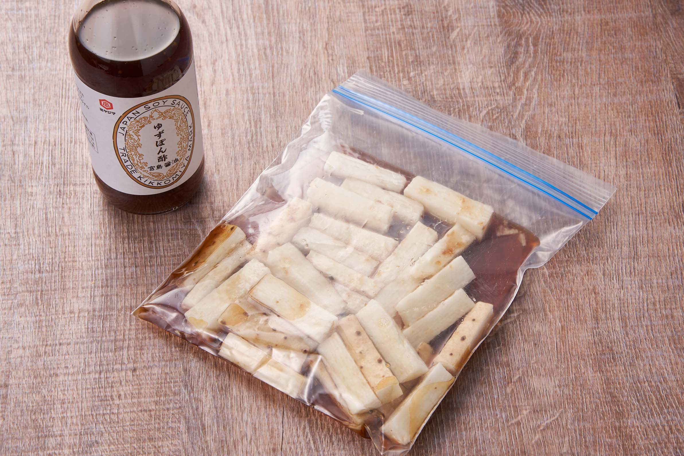 保村袋に1を入れてゆずぽん酢を注ぎ、30分程度漬ける。