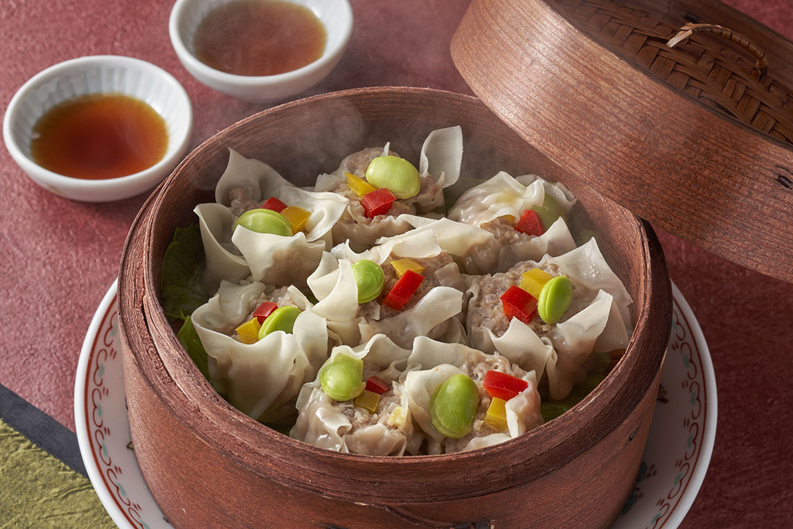 シュウマイを蒸して、ぎょうざのたれを添える。