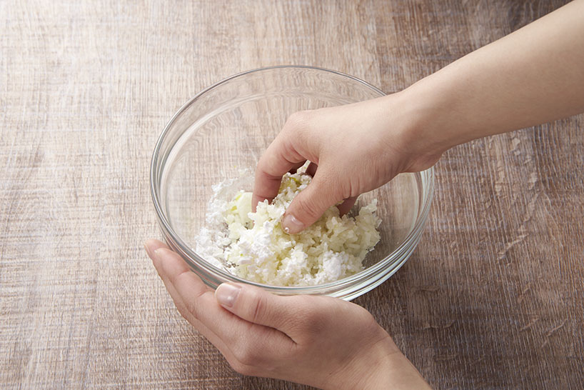 玉ねぎ、ネギはみじん切りにして、片栗粉をまぶす。