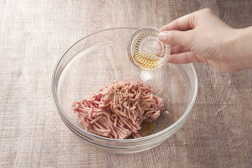 豚ミンチは練り混ぜ、調味料と1を加える。