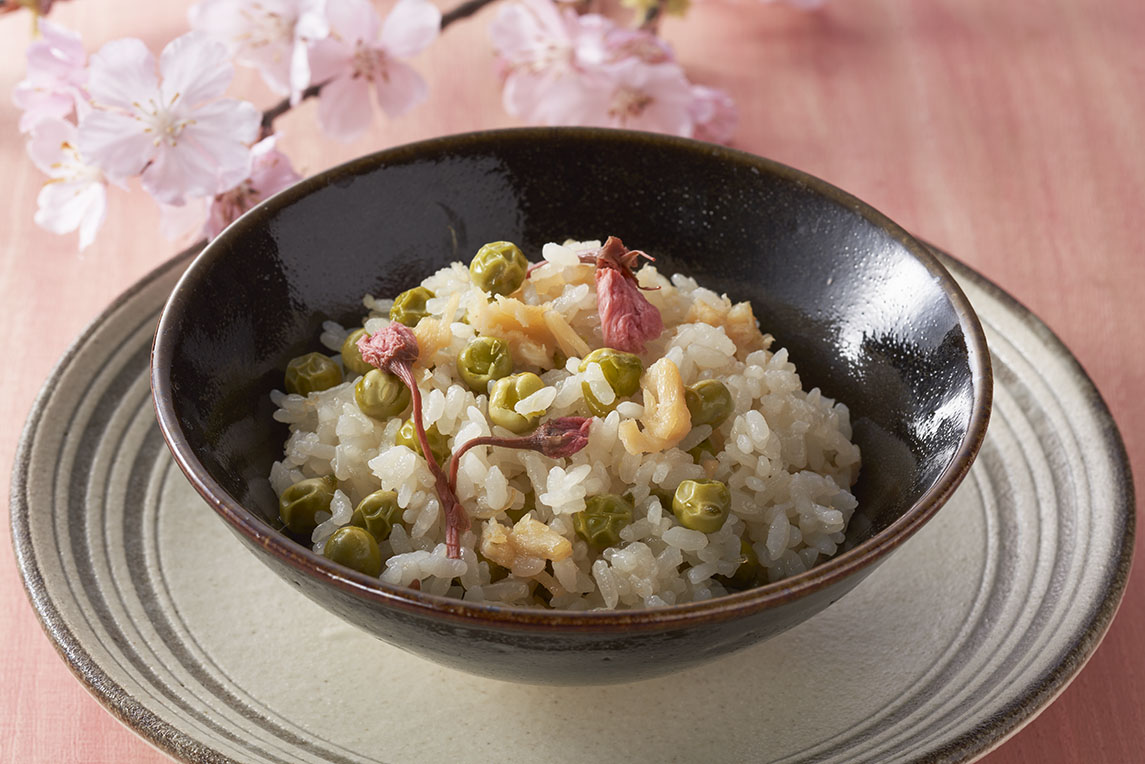ご飯が炊き上がったらさっと混ぜて、桜を散らし、器によそう。
